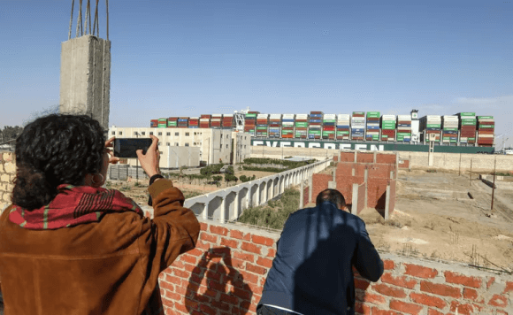 写真:スエズ運河を出港するコンテナ船エバー・ギブンを撮影する人々© AP Photo / Mohamed Elshahed