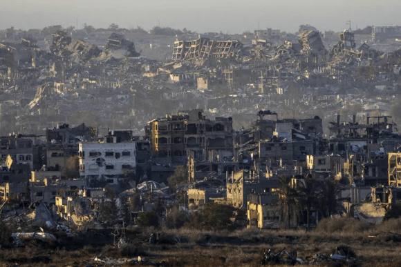 写真:イスラエル南部からガザ地区の破壊された建物を望む@AP Photo / Ariel Schali
